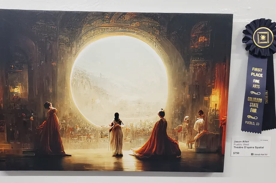 Jason Allen, as quoted in many places, was announced as a winner of the digital art category at the Colorado State Fair fine arts competition. His submitted work was titled Théâtre D’opéra Spatial and has been described as a sci-fi/fantasy scene of epic proportions showing a portal and some people. Allen used the A.I. Midjourney to create the image, and Gigapixel, also an A.I. based system, to upscale the work before printing it on canvas.