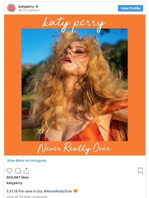 The pop icon revealed Tuesday the name of her upcoming song, “Never Really Over,” which is set for release on May 31, 2019.
