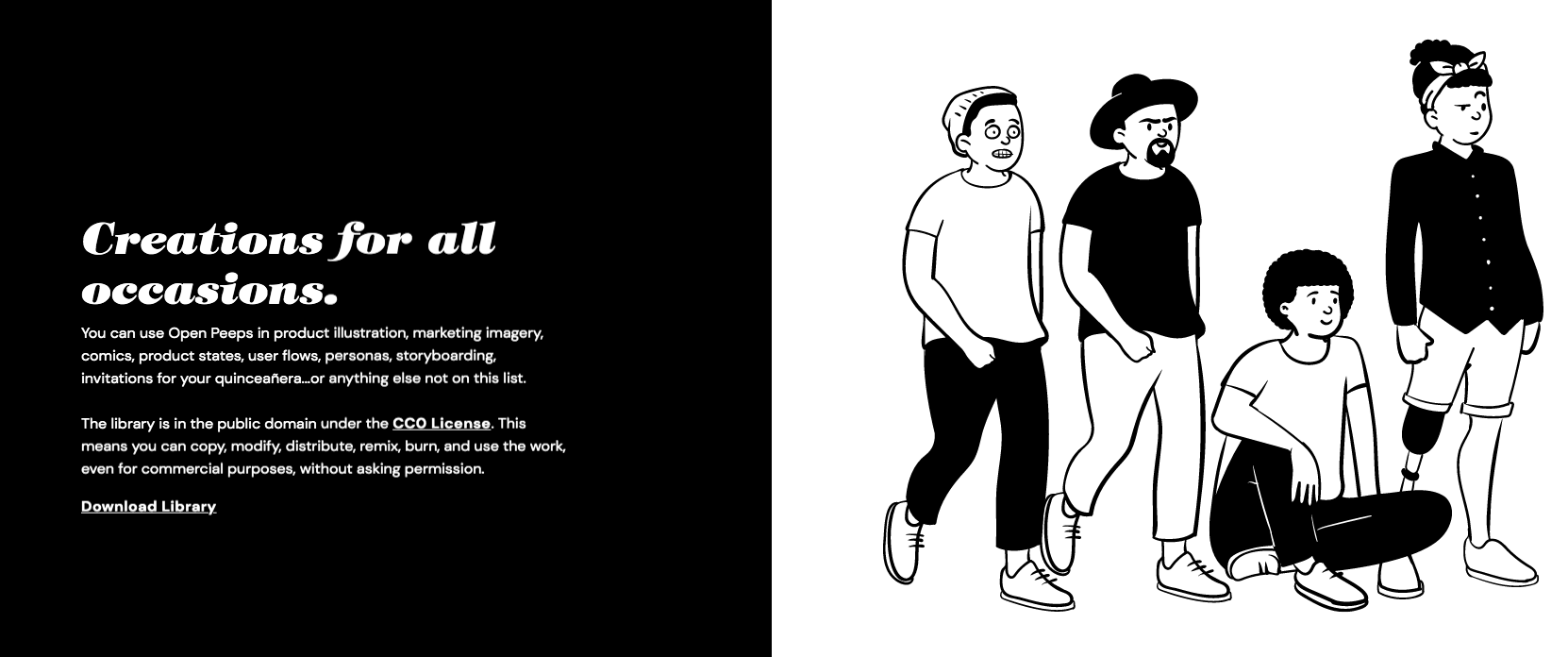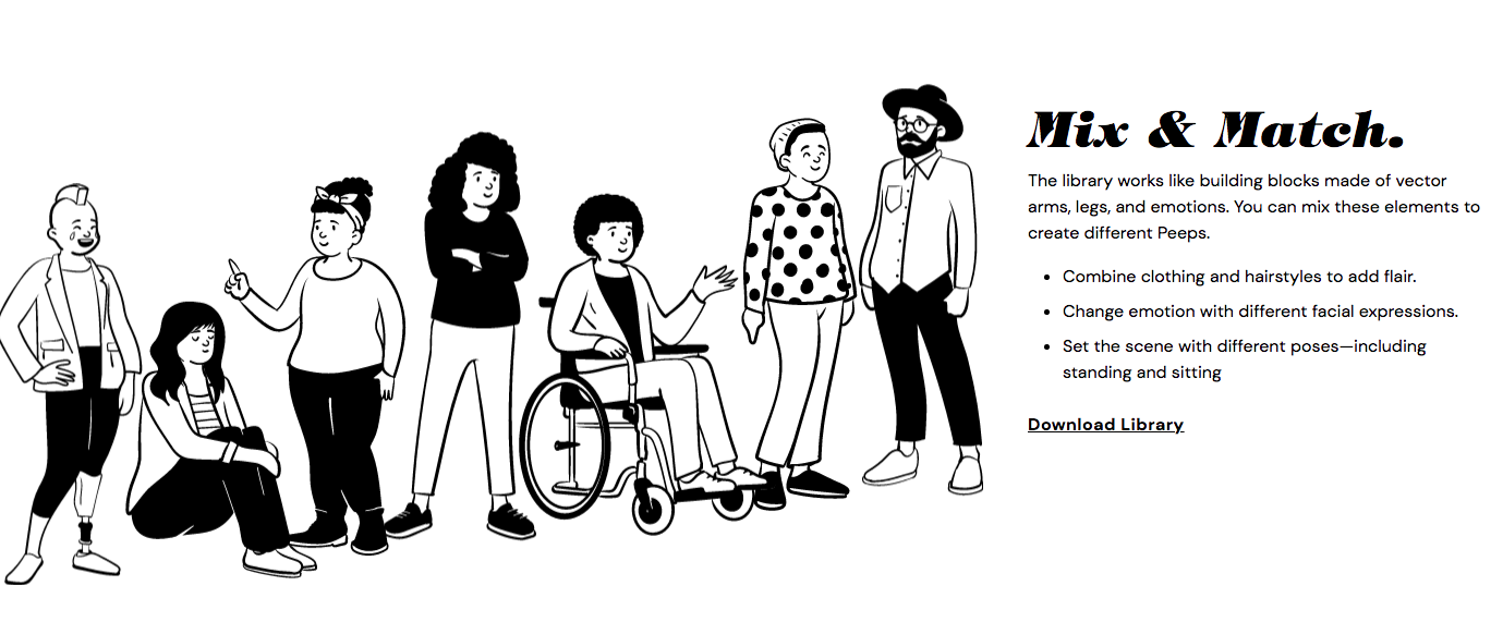 Open Peeps is more than just an illustration library with free licenses. It allows you to create illustrations for various media, from digital to printing and audio-visual. The basic black-and-white hand-drawn figures give you blank canvases to unleash your ideas.