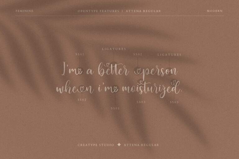 Attena Modern Calligraphy is perfect for branding projects, logo, wedding designs, social media posts, advertisements, product packaging, product designs, label, photography, watermark, invitation, stationery and any projects that need handwriting taste.