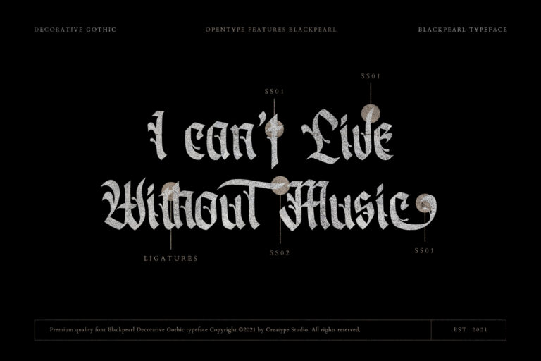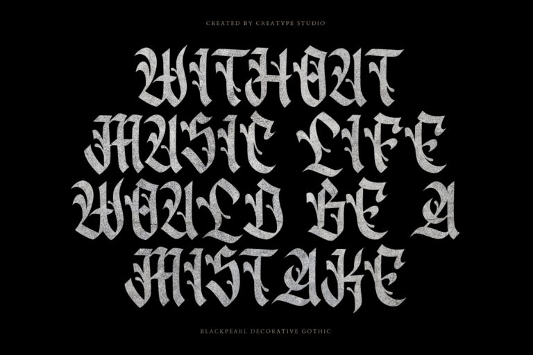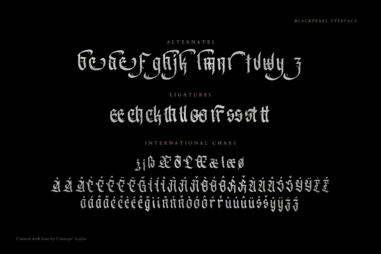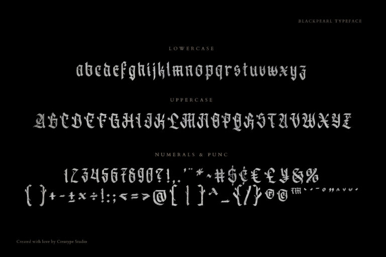 Blackpearl is a decorative gothic inspired by the blackletter font. These fonts are specially crafted and pay close attention to strokes resulting in great looking fonts with their unique and bold shapes.