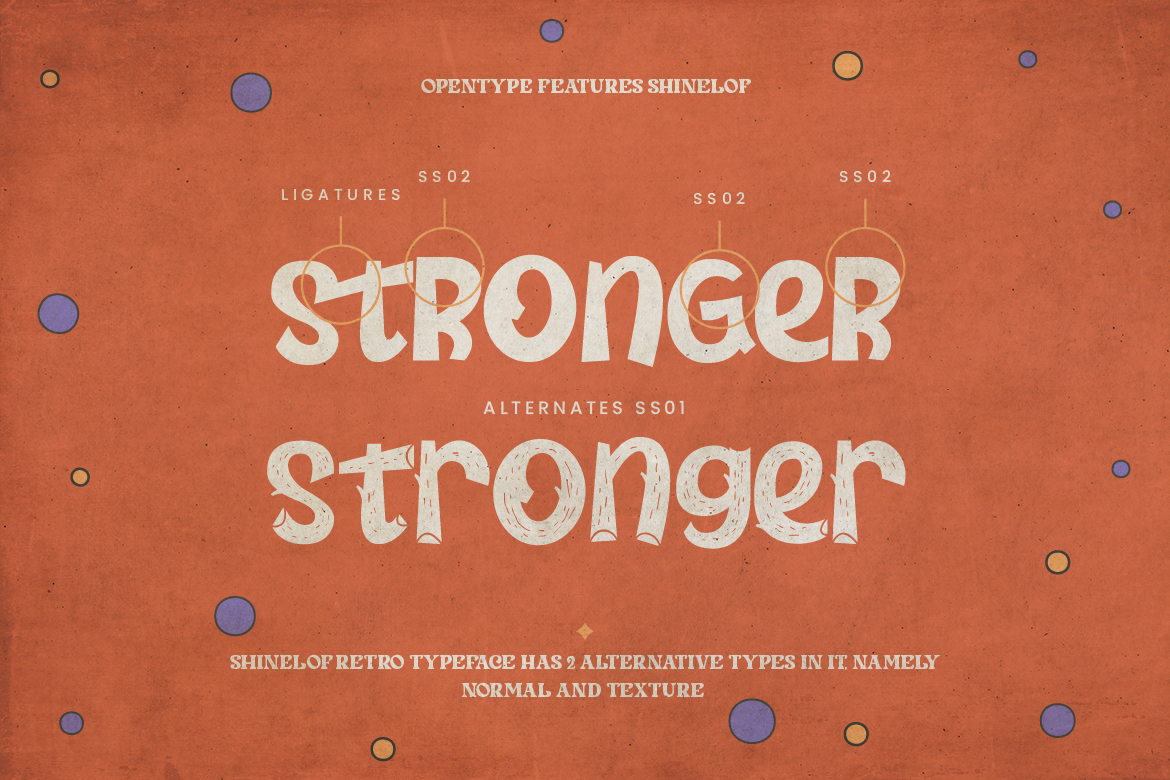 Introducing Shinelof – A retro typeface made with a unique shape that makes this font look different from other retro fonts. Shinelof has 20 types of ligatures and 41 types of alternatives in the purchase package, also there are alternative types of textures in it’s making this font your first choice. The font is perfect for for movie title, logo, blogging, brand identity, book title, social media, branding, wedding invites, cards or simply use it in your next design project and suitable to use for many occasion.