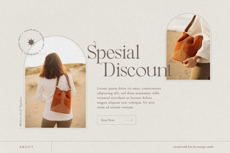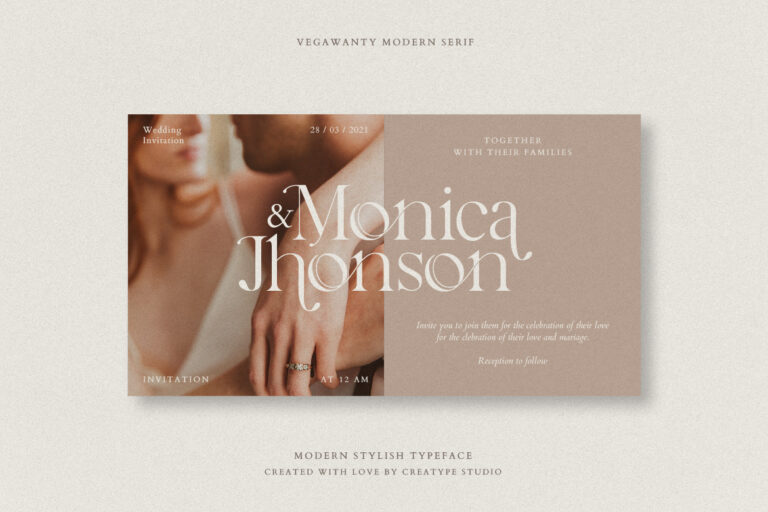 Vegawanty Modern Serif is perfect for branding projects, logo, wedding designs, social media posts, advertisements, product packaging, product designs, label, photography, watermark, invitation, stationery and any projects that need handwriting taste.