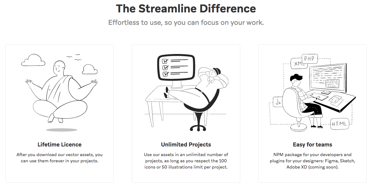 As a designer’s resource, Streamline offers compatibility with various design tools. You can use the images and icons to create your designs with Figma and Sketch, for example. You can also work Streamline’s NPM packages with your codebase projects when designing websites.